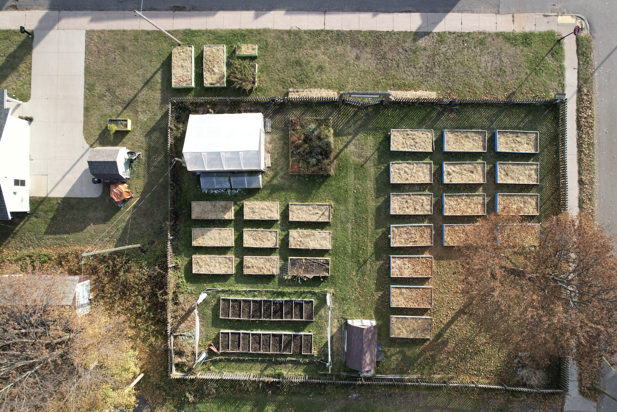Aerial photo of the Partridge Creek Community Garden. Photo taken by Lindsay Bean.