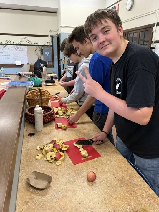 Top left: 5th grade students at the 5th Grade Farm Stand, photo by Camden Kinnie. Top right: Education Coordinator Keats Dormont teaches students in Homeschool Hangout, photo by Mary Andronis. Bottom left: Students cook during the Healthy Cooking Program, photo by Mary Andronis. Bottom right: High School CTE students cut local apples for cider, photo by: Keats Dormont.