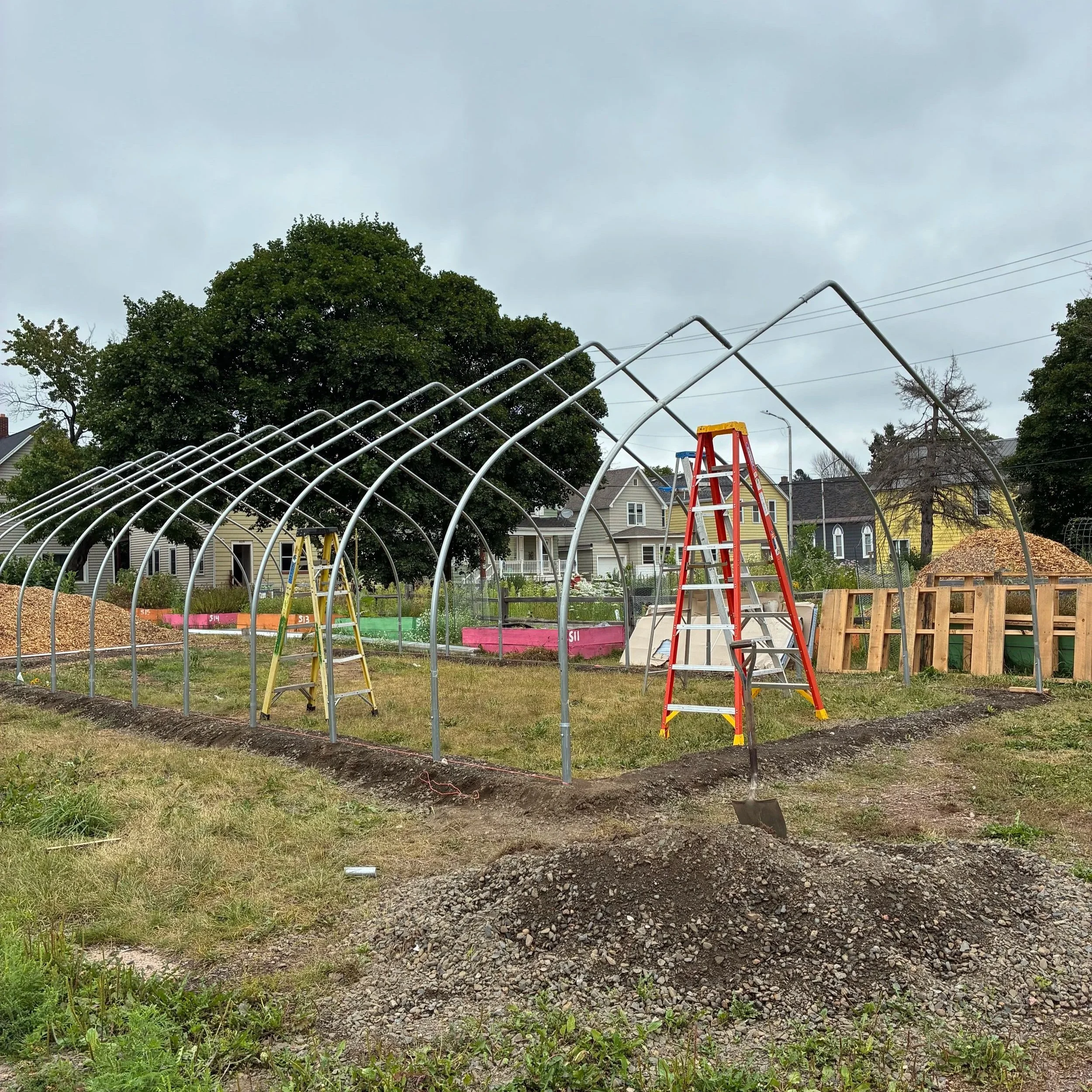 Photo: The greenhouse build at the Ishpeming Middle School Garden. The site was prepared with help from GLRC youth. Photo taken by PCF’s Keats Dormont