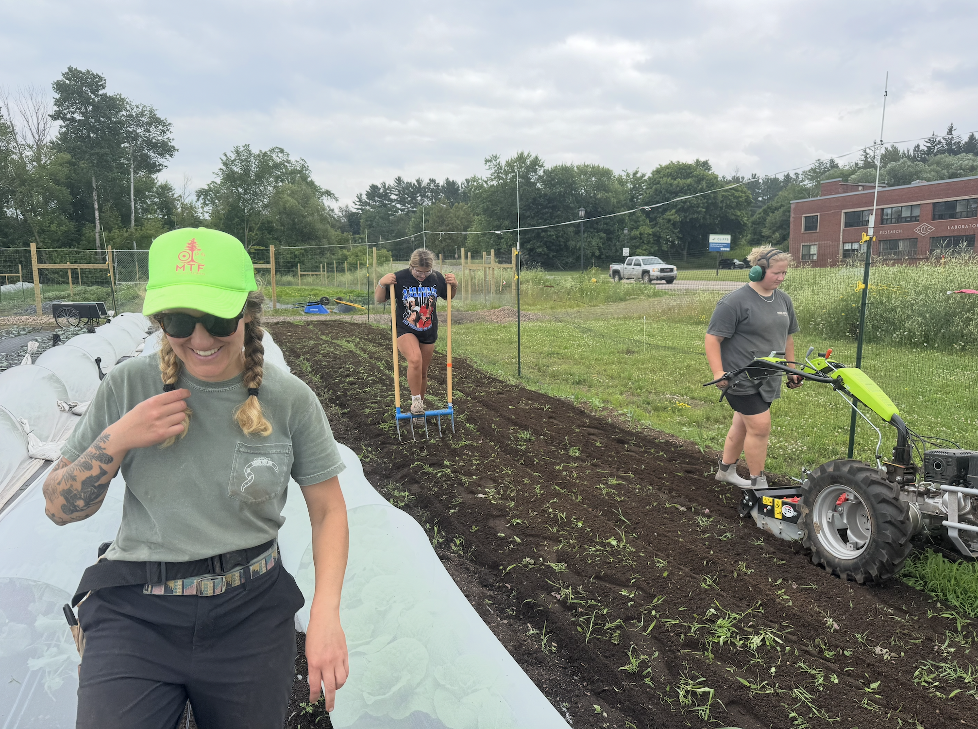 Partridge Creek Farm manager Allison Stawara and interns Journey Comment and Brynn Way-Lanala prepare a bed for planting onions. Photo credit: Abbey Palmer