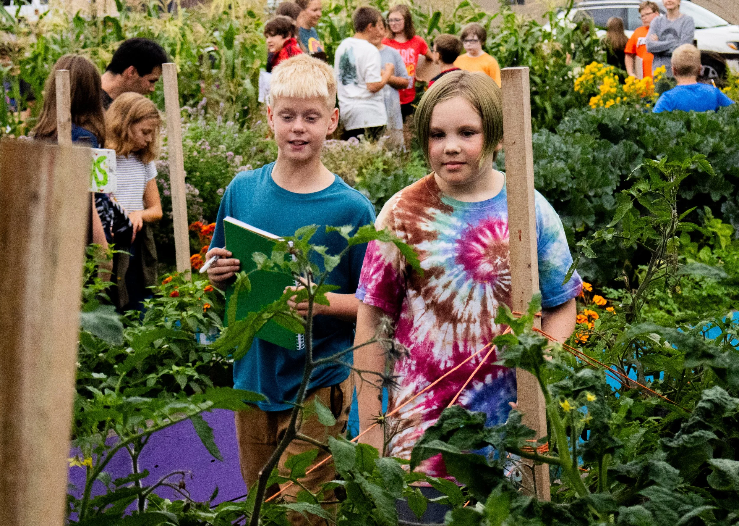 5th grade students learn about vegetables growing in the Ishpeming Middle School Garden led by PCF Education Coordinator, Keats Dormont. Photo taken by PCF’s Camden Kinnie.